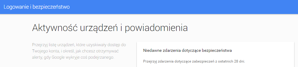 5. Jestem na docelowej podstronie. Dużo szarego tła. Dużo tła maskuje brak informancji. Już podświadomie wiem, że się nie dowiem. A oto co widać (to jest, dzisiaj już nie widać, bo minęło 28 dni): dwie przeglądarki, jedna jak sądzę moja, logująca się z Polski, nawet dosyć dokładnie, trafiliście. Polska, mieszkam w Polsce. Oraz druga przeglądarka, której nie posiadam. Przejrzałam swój komputer i oficjalnie stwierdzam że nie posiadam Google Chrome 52. Logująca się w godzinie w której ja logowałam się ze swojej świadomie posiadanej. Jedna data (ostatniego logowania czy diabli wiedzą czego). Jakaś data, jakaś przeglądarka. Jakiś tekst, jakaś muzyka (to nie jest do końca ważne)(cytat z mietka mietczyńskiego) Jakaś geolokalizacja z disklajmerem że może być niedokładna. (dobry żart!) (Miasto się nie zgadza, dosyć znacznie, oraz nie wiem co google rozumi poprzez "sąsiednie" oraz "miasto".)